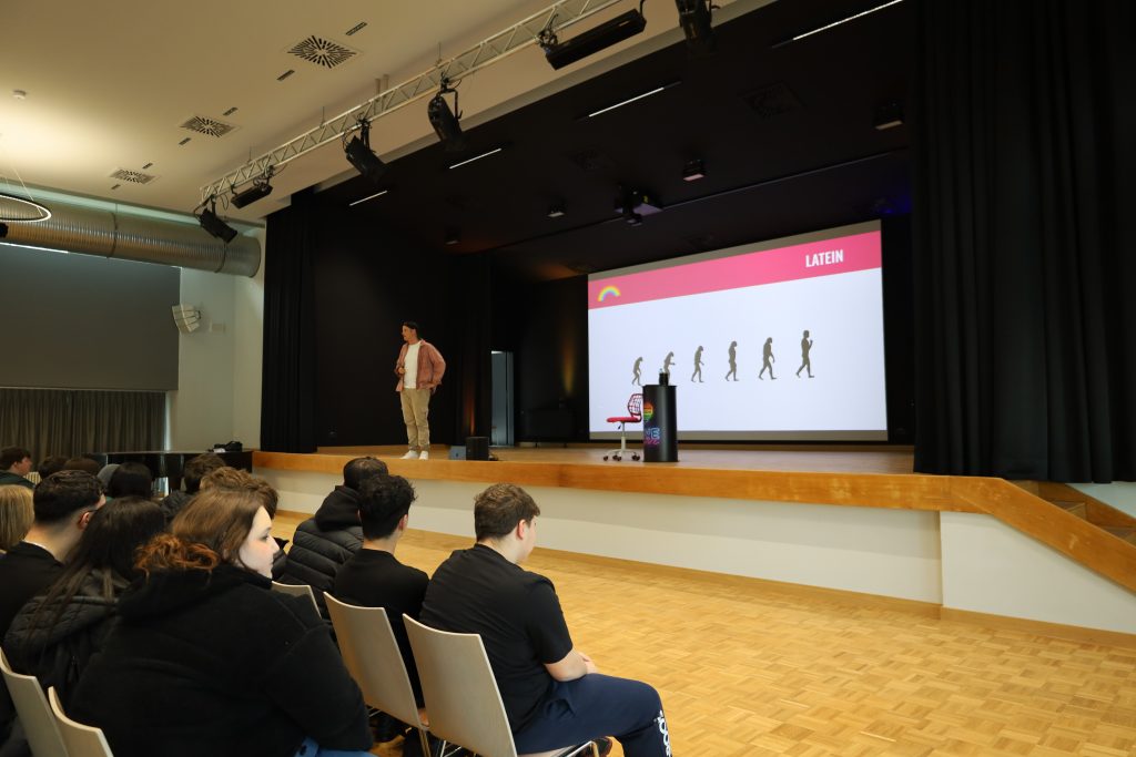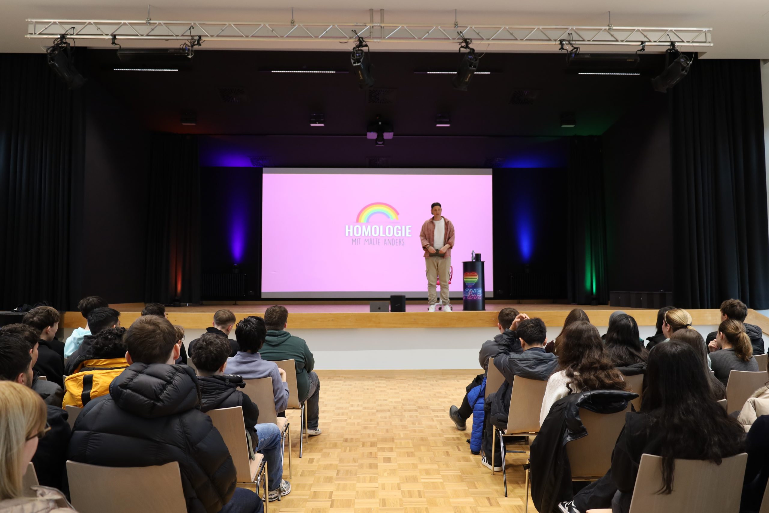 Der Theaterpädagoge und Kabarettist Timo Becker schlüpfte extra für unsere Schülerinnen und Schüler in der Aula des benachbarten Marie Luise Kaschnitz-Gymnasiums in seine Paraderolle als „Malte Anders“ – ein sympathischer, leicht nerdiger Typ, der mit viel Selbstironie aus seinem Leben als homosexueller Mann erzählt.